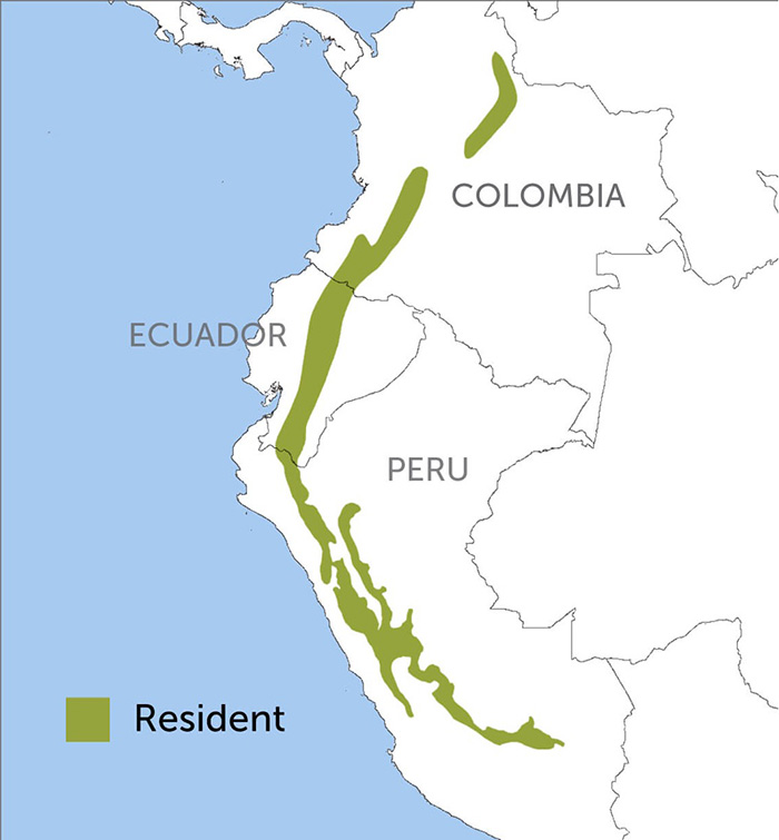 The Shining Sunbeam occurs high in the Andean Mountains at elevations from 8,000 to 14,000 feet. Its range stretches from Colombia south through Ecuador and Peru. Like many other mountain-dwelling hummingbirds such as the Critically Endangered Gorgeted Puffleg and the Booted Racket-tail, the Shining Sunbeam makes elevational movements in pursuit of flowering plants and their stores of nectar.